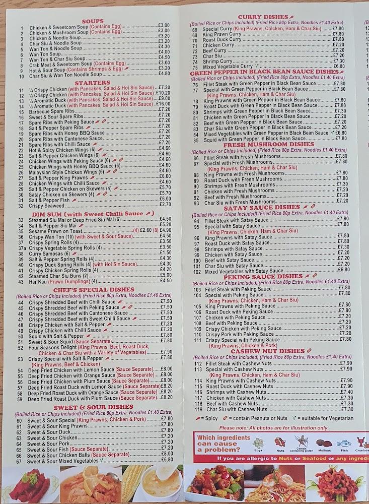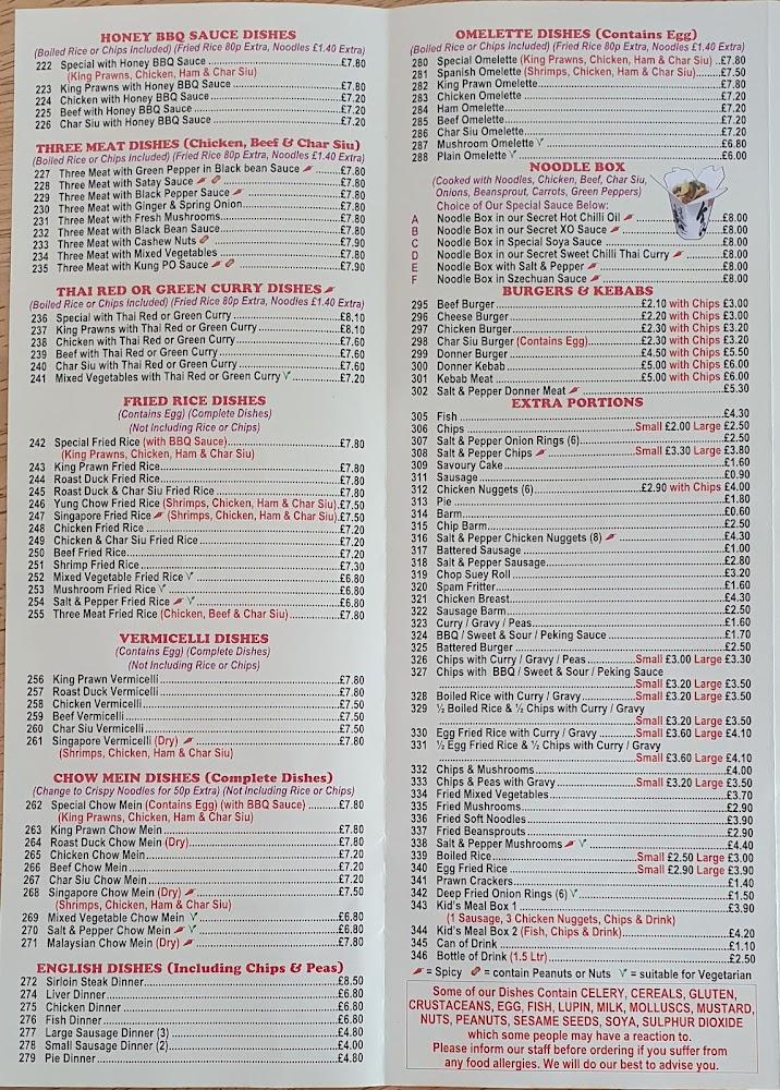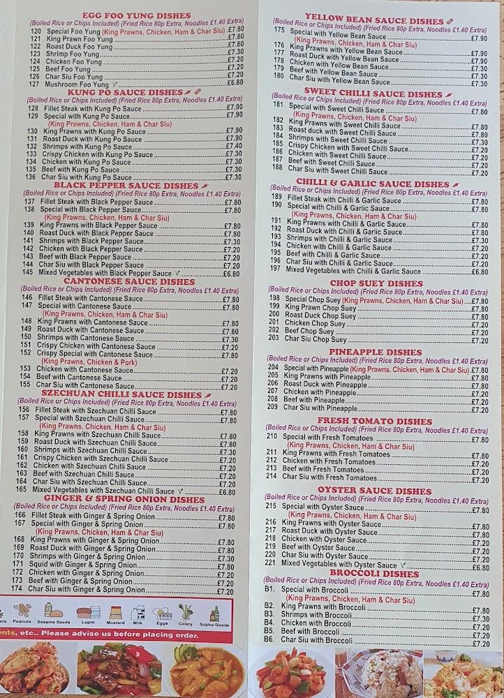 May Bo’s menu presents an expansive selection of Chinese dishes, appealing to all tastes. Beginning with a variety of soups like the beloved chicken and sweetcorn and the delicious wonton, patrons have a warm and comforting start to their meal. The star section includes a diverse range of starters, featuring classic spare ribs in various sauces like Peking and honey BBQ. Dim sum options are plentiful, ensuring fresh flavors with every bite. Chef's specials showcase dishes like crispy shredded beef and sumptuous crispy chicken, catering to those looking for something unique. For curry lovers, a dedicated section offers comforting choices, showcasing meats in fragrant sauces. Seafood is also well represented, with king prawns and squid taking precedence in several dishes. Vegetarians will find plenty to enjoy as well, all offered at reasonable prices, consistently around £10 or less for fulfilling meals. With ample options for every palate, the menu at May Bo encourages exploration.